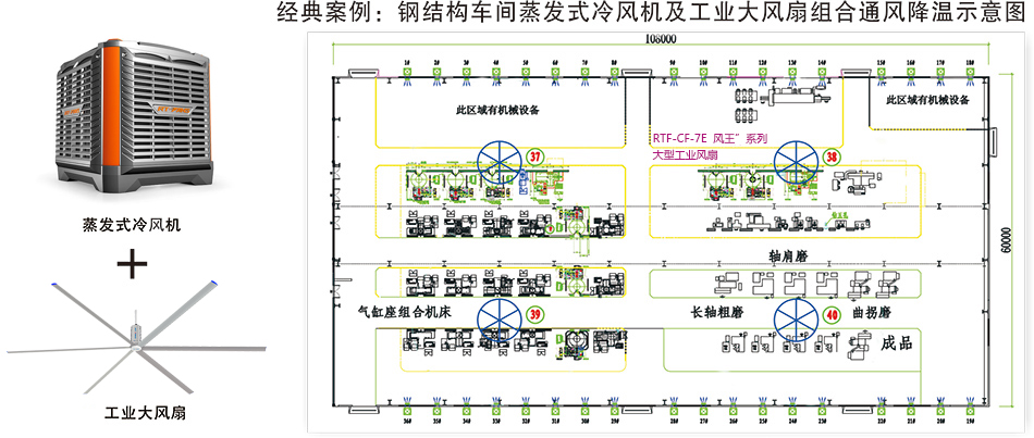 1、翻中所示為鋼結(jié)構(gòu)大跨度生產(chǎn)車間,有熱源,夏季室內(nèi)溫度較高。圈上37-44號(hào)為RTF-CF-7E"風(fēng)王"系列,大型工業(yè)風(fēng)扇,1-36號(hào)為瑞泰風(fēng)RTF18型蒸發(fā)式環(huán)??照{(diào)。風(fēng)扇直徑為7.3米。空氣流通量為13200立方米/分鐘,每臺(tái)風(fēng)扇的氣流覆蓋面積視安裝高度可達(dá)1000-1600平方米,空氣流動(dòng)至少可以延伸到以風(fēng)扇中心20米為半徑的區(qū)域,空氣流動(dòng)的風(fēng)速約為2-3米/每秒,轉(zhuǎn)速為53轉(zhuǎn)/分鐘.電機(jī)率為1. 5KW,變頻驅(qū)動(dòng).無(wú)級(jí)調(diào)速;環(huán)??照{(diào)功率為1.1KW,冷風(fēng)量為18000立方米/小時(shí),安裝于車間外墻。